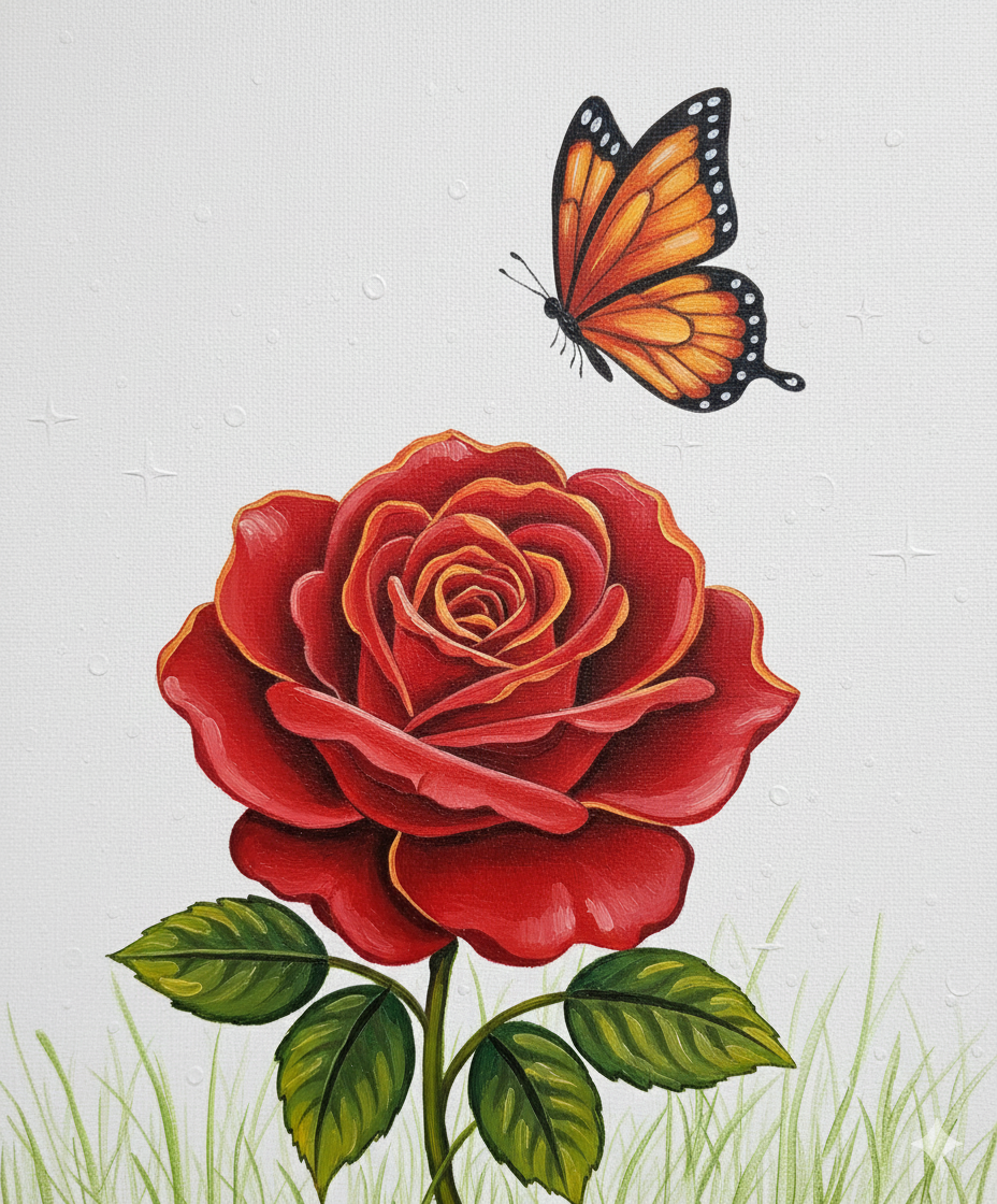 Paint a stunning classic red rose with a graceful monarch butterfly. This beautiful design brings together bold colors and delicate details in a piece you will be proud to display.